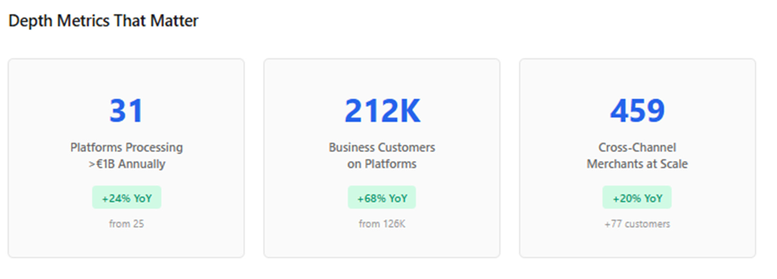 Platforms is where the architecture shows its final form. Revenue grew 50% to €68.6 million. Volume grew 23%, or 53% excluding eBay. Adyen now has 31 platform customers processing over €1 billion annually (up from 25), with 212,000 business customers on those platforms (up from 126,000).