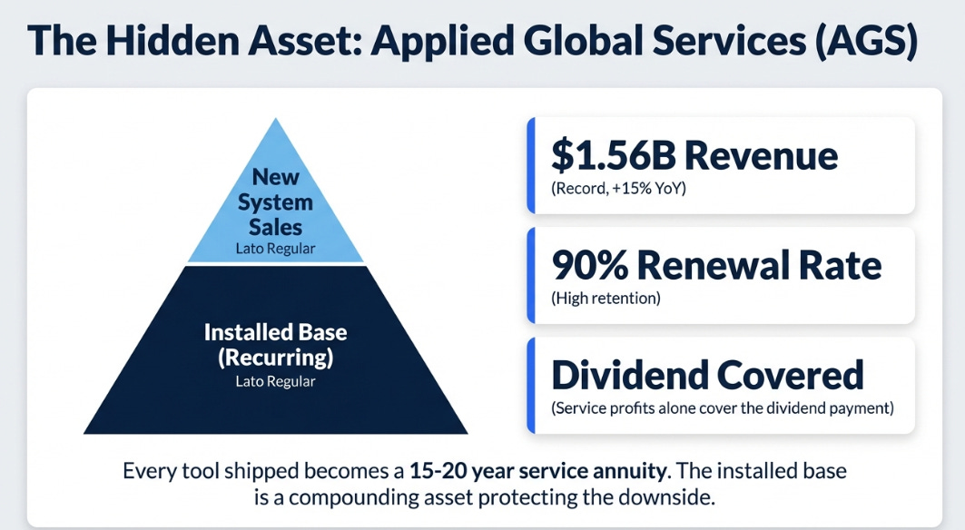 One more detail worth noting: Applied Global Services hit record revenue of $1.56B, up 15% year-over-year, with two-thirds under contract and 90% renewal rates. Hill disclosed that AGS cash profitability now covers the entire dividend. Every tool AMAT ships during this upcycle becomes a 15-20 year service annuity. The installed base is a compounding asset that the market consistently undervalues.