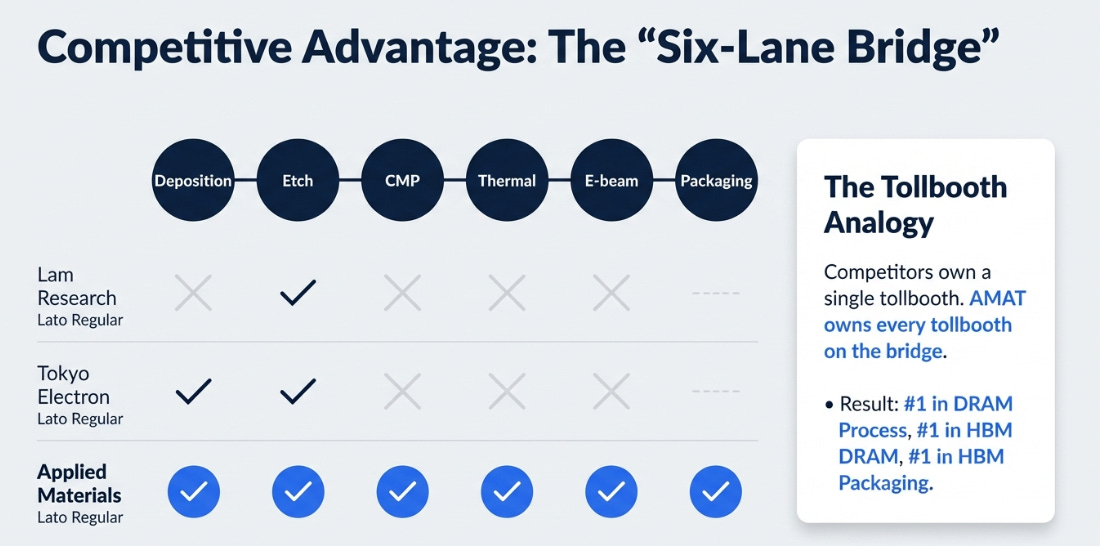 What makes this specifically an Applied Materials story, rather than a generic semi-cap tailwind, is the breadth of their exposure to the HBM production flow. Lam Research is strong in etch. Tokyo Electron is strong in deposition and coater/developers. But HBM fabrication and packaging touches deposition, etch, CMP (chemical mechanical planarization), thermal processing, e-beam inspection, and advanced packaging, and AMAT has leading or dominant positions across all of them. They capture revenue at five or six points in the HBM production process where a competitor might capture one or two. It’s the difference between owning a tollbooth on the highway and owning every tollbooth on a six-lane bridge. That breadth is why AMAT can credibly claim #1 in DRAM process equipment, #1 in HBM DRAM, and #1 in HBM packaging simultaneously, and why the DRAM mix shift accrues disproportionately to them.