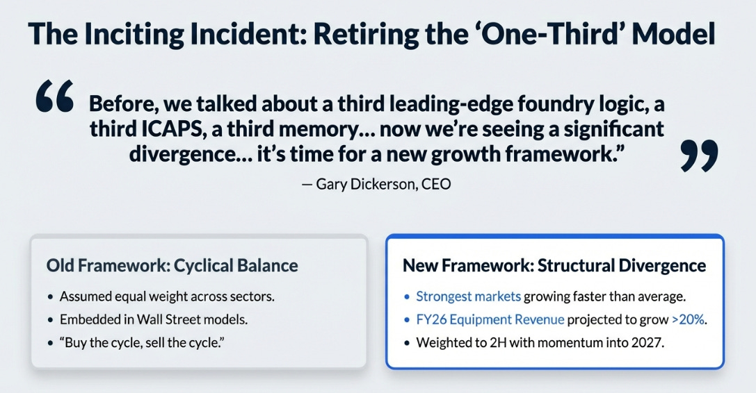 A framework shift, not just a beat. Q2 guidance crushed expectations (+$620M revenue, +15% EPS vs. Street), and CEO Gary Dickerson formally retired the “one-third foundry / one-third memory / one-third ICAPS” model, signaling structural divergence, not cyclical balance.
