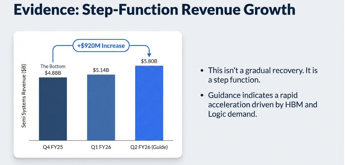 Semi Systems bottomed at $4.88B in Q4 and is guided to $5.80B in Q2, a $920M increase in two quarters. This isn’t a gradual recovery. It’s a step function.
