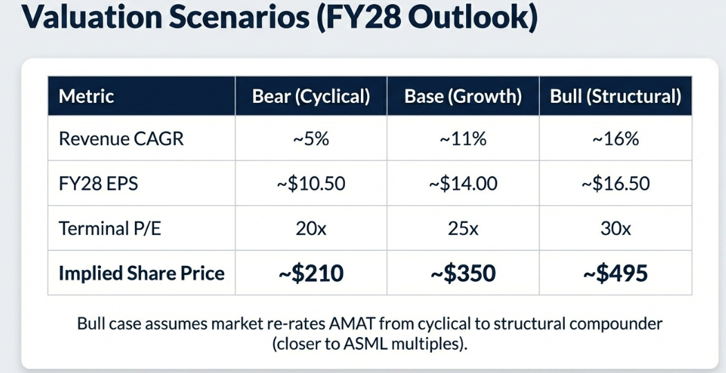 The bull case requires WFE to grow mid-teens in both CY26 and CY27, with AMAT outgrowing the market by 3-5 points on GAA and HBM content gains. Gross margins breach 50% as value-based pricing takes hold and the high-margin product mix (e-beam, advanced packaging tools) becomes a larger share. The market re-rates AMAT from cyclical (25x) to structural compounder (30x), closer to where ASML trades. This is the scenario where Dickerson’s “new framework” comment looks prescient.