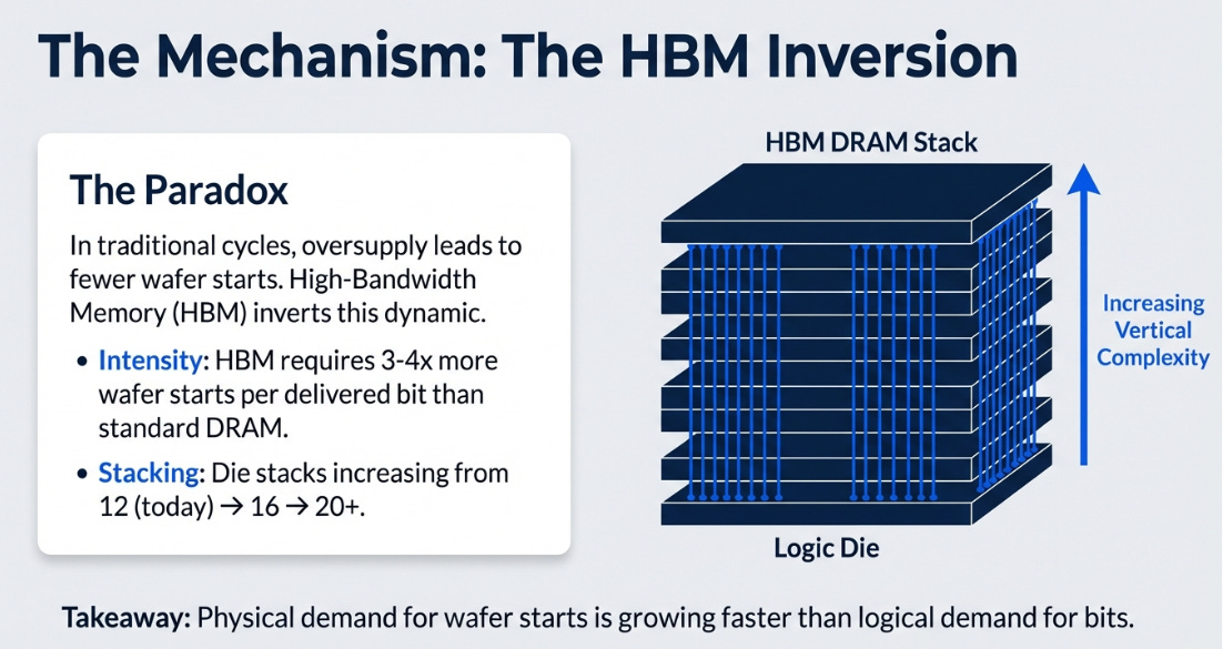 In a traditional memory cycle, oversupply means fewer wafer starts. HBM inverts this: the physical demand for wafer starts grows much faster than the logical demand for bits, because each bit requires 3-4x more silicon and increasingly complex packaging. Each additional die in the stack requires deposition and etch steps at both the wafer and packaging level. Even if bit demand moderates, wafer start demand, which is what drives equipment sales, can continue growing. The complexity per bit is compounding, not flattening.