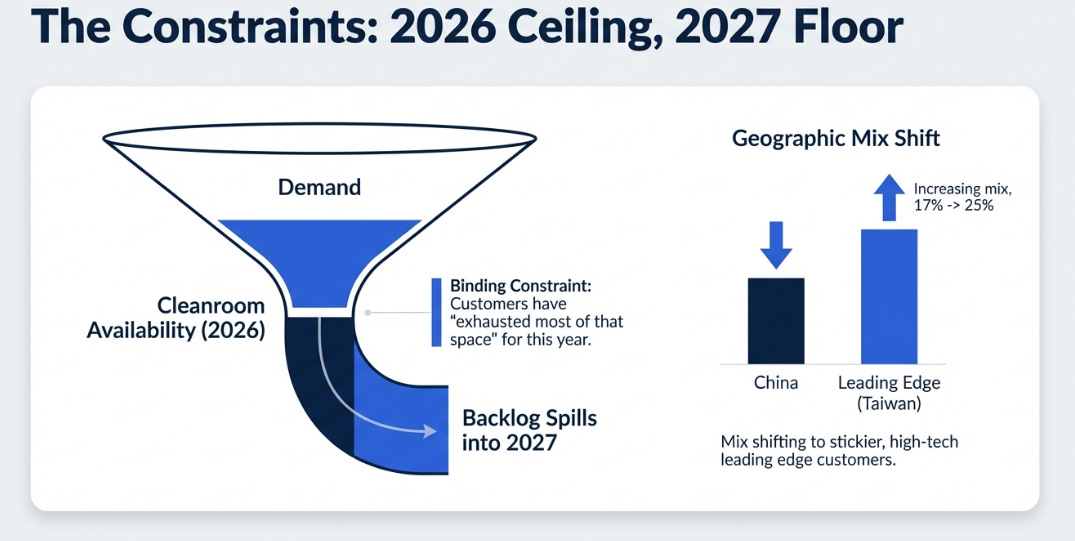 And here’s what makes this a multi-year story rather than a one-quarter trade: cleanroom availability is the binding constraint on 2026 growth.