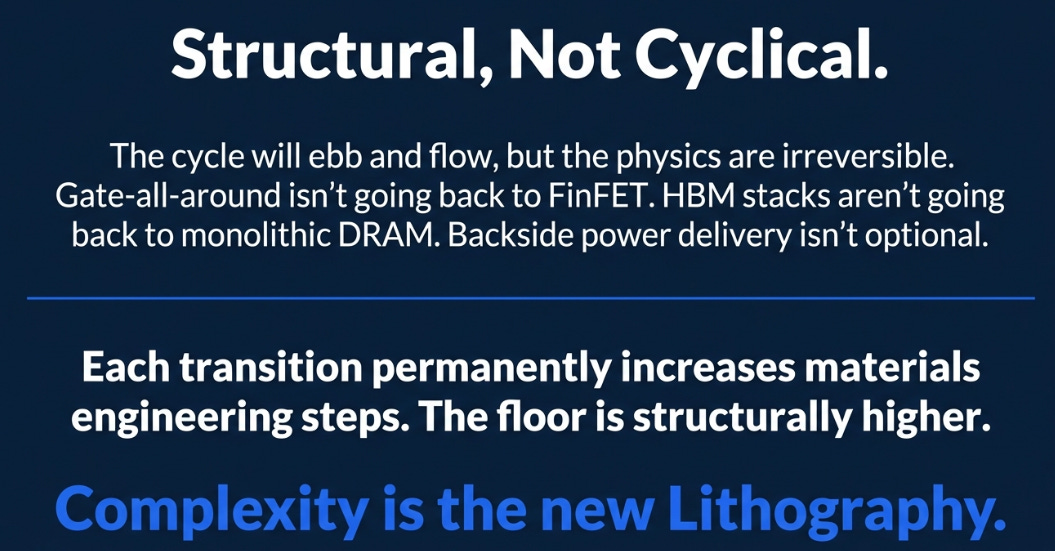 But I keep coming back to the physics. Gate-all-around transistors are not going back to FinFETs. HBM stacks are not going back to monolithic DRAM. Backside power delivery is not optional. Each of these transitions permanently increases the number of materials engineering steps per chip, and Applied Materials has the broadest portfolio to address them. The cycle will ebb and flow, it always does. But the level to which it ebbs is structurally higher than it was five years ago, and will be structurally higher still five years from now.
