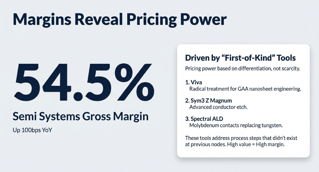 Margins reveal pricing power. Semi Systems gross margin hit 54.5%, extraordinary for hardware. First-of-kind tools (GAA, molybdenum contacts, advanced packaging, e-beam) suggest differentiation-driven pricing, not scarcity-driven uplift. The key question: structural inflection or another cycle peak?