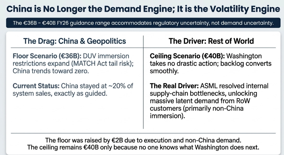 That sentence has never appeared in an ASML press release before. It is not legal boilerplate, it is in the paragraph where Fouquet explains the revenue numbers, not in the forward-looking statements appendix. Management is telling investors, in the most direct language available, that the €4 billion guidance range is not demand uncertainty. It is China regulatory scenario uncertainty. Strip out the MATCH Act tail risk and ASML’s real 2026 guide is the upper half of the range. The floor of €36 billion, roughly flat with FY25, is the scenario where DUV immersion restrictions expand materially and China trends toward zero. The raise of the floor by €2 billion reflects growing confidence in non-China demand. The ceiling staying at €40 billion reflects the fact that nobody knows what Washington does next.
