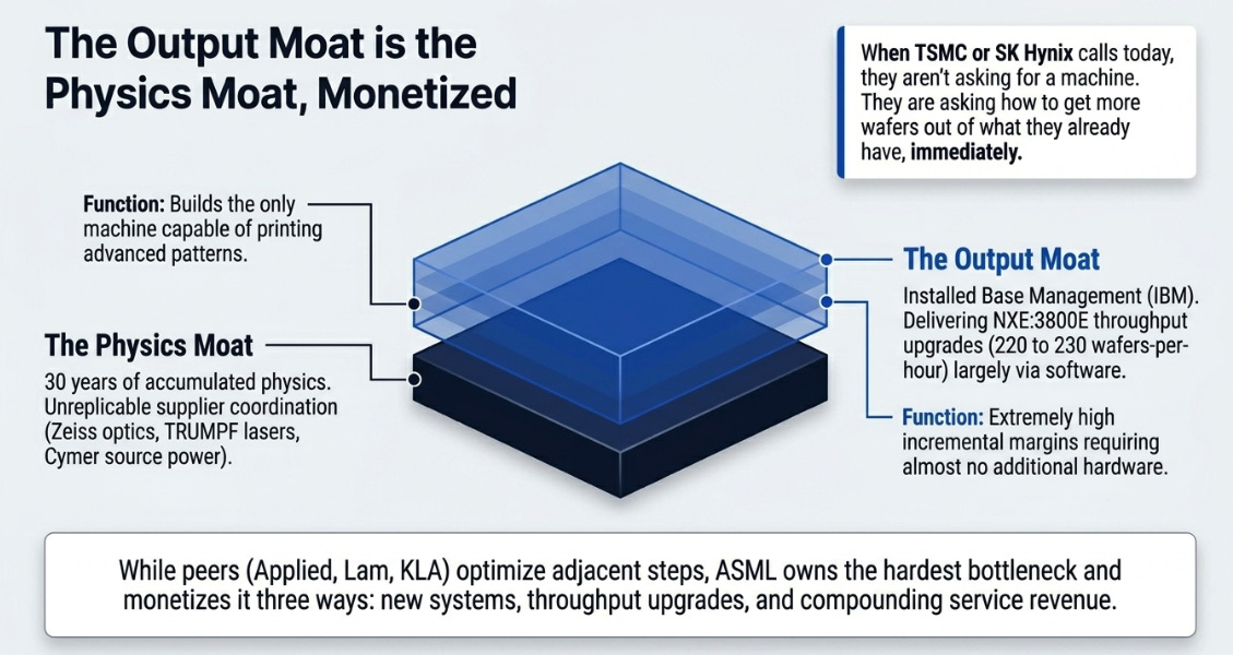 The distinction matters when you compare ASML to its equipment peers. Applied Materials, Lam Research, and KLA all matter enormously. They optimize adjacent steps in the process. But ASML owns the hardest bottleneck, the step where light becomes pattern and pattern becomes transistor, and it is monetizing that bottleneck three ways simultaneously: new system sales, throughput upgrades on systems already in the field, and compounding service revenue on a growing installed base. No competitor can upgrade an ASML tool. The output moat is the physics moat, monetized.