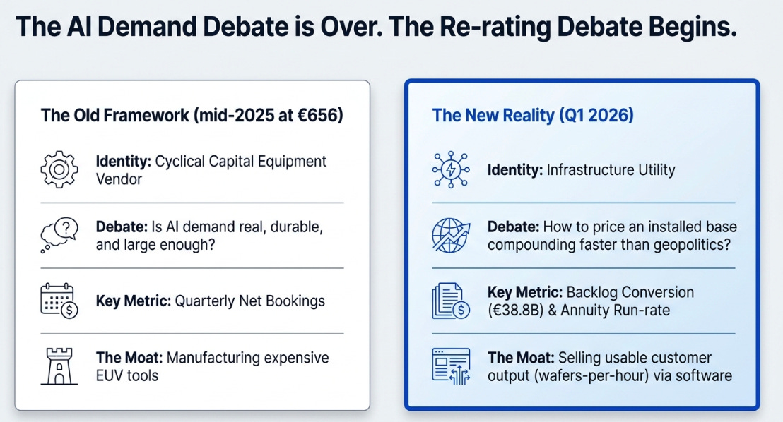 The old debate was whether AI demand was real. That debate is over. The new one is whether ASML is still a cyclical tool vendor, or an infrastructure utility whose installed base compounds faster than