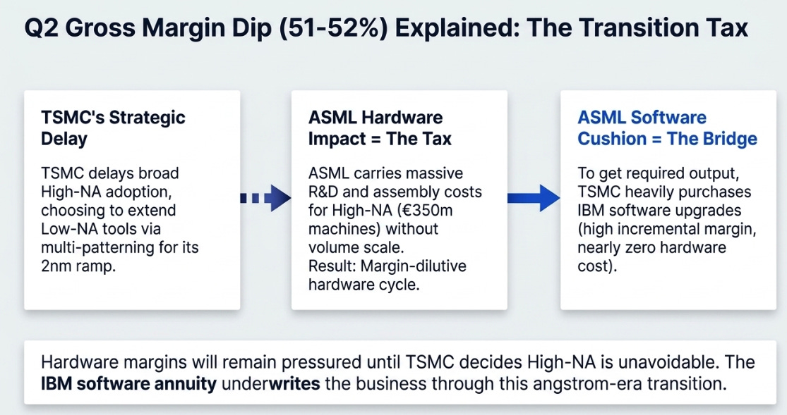 This transition is not without friction. If IBM is booming at extremely high margins, why did ASML guide Q2 gross margins down to 51-52%? The answer is that the hardware side of the business is currently absorbing a transition tax. High-NA EUV tools, €350 million machines required for angstrom-era chips, are margin-dilutive at current volumes. TSMC, ASML’s most important customer, is deliberately delaying broad High-NA adoption by extending its existing Low-NA tools through multi-patterning. TSMC is powerful enough to make that choice, and it is powerful enough to make ASML carry the R&D and assembly costs of the transition without granting the volume scale that would make it profitable. The hardware margin is compressing precisely because the most important customer in the world has decided not to move yet. That makes the IBM software floor not just an attractive business, it makes it an economic necessity during the transition.