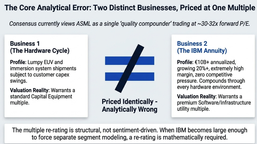 The better frame: two businesses, one multiple. The hardware cycle, EUV and immersion system sales, is priced at a capital equipment multiple. The IBM infrastructure annuity, €10 billion annualized, growing 20%+, extremely high incremental margins on software upgrades, zero competitive pressure by definition, is priced identically. That is analytically wrong. A monopoly infrastructure annuity that compounds through every hardware environment is not the same business as lumpy system shipments that swing with customer capex cycles.