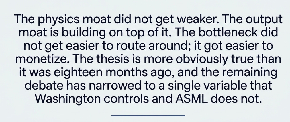The physics moat did not get weaker. The output moat is building on top of it. The bottleneck did not get easier to route around, it got easier to monetize. That is the update. Not a change of view, but a sharpening of it: the thesis is more obviously true than it was eighteen months ago, the evidence is more concrete, and the remaining debate has narrowed to a single variable that Washington controls and ASML does not.
