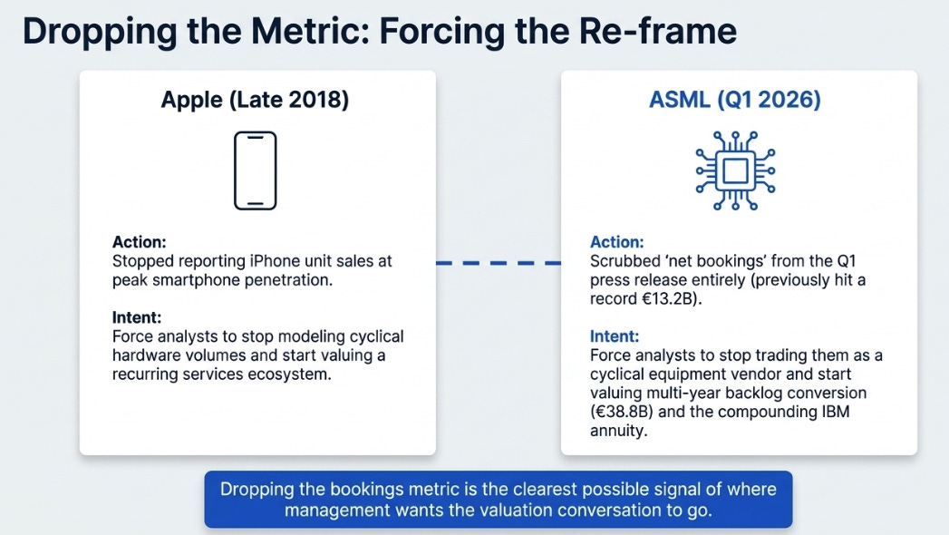 This is Apple in late 2018, when the company stopped reporting iPhone unit sales at the exact moment peak smartphone penetration had been reached. Apple knew the unit cycle had plateaued and wanted analysts to stop modeling hardware volumes and start valuing a services ecosystem. ASML is executing the same reframe. They have €38.8 billion in backlog. They do not need quarterly bookings to prove demand exists. What they need is for the market to stop trading them as a cyclical equipment vendor and start valuing a company with multi-year backlog conversion and a compounding installed-base annuity. Dropping the metric is the clearest possible signal of where they want the conversation to go.