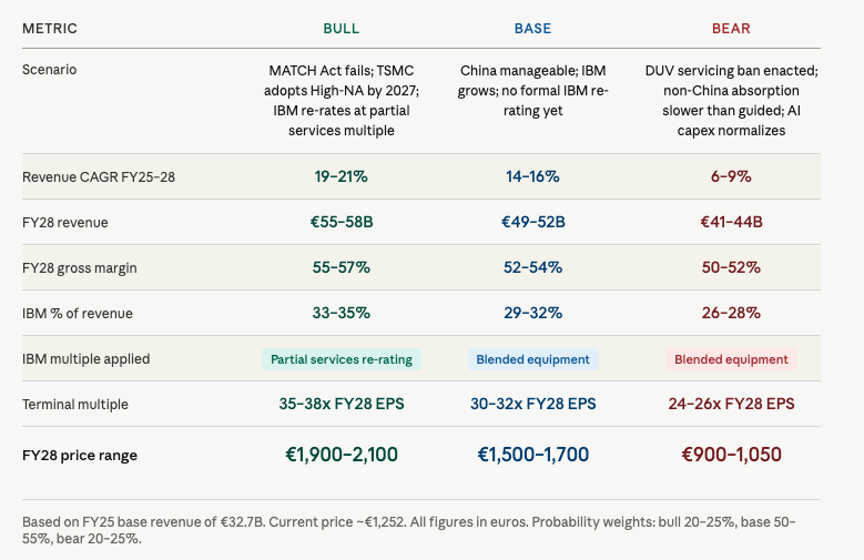 The critical distinction in the bull case is that the IBM re-rating does as much work as revenue growth. Most bull cases on ASML are simply higher revenue assumptions on the same multiple. The IBM multiple uplift is separate and additive, it happens when IBM segment reporting forces a model rebuild independent of what the hardware cycle is doing. In the bear case, IBM cushions the downside but cannot absorb a €5-6 billion China revenue shock plus lost servicing revenue simultaneously. In the base case, ASML earns its multiple through earnings growth, not a disaster, not a re-rating, a business that rewards patient ownership at current prices.