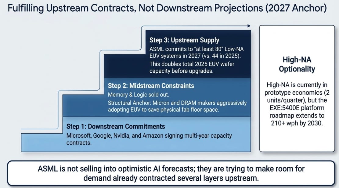 The customer behavior confirms what the language suggests. Memory customers are sold out for the rest of the year and expect supply limitations to persist beyond 2026. Logic customers are expanding across multiple advanced nodes simultaneously. Both groups are responding not to optimistic forecasts but to committed purchase orders from their own downstream customers, Microsoft, Google, Nvidia, Amazon signing multi-year contracts that require the capacity. ASML is not selling into demand projections. It is fulfilling demand that is already contracted several layers upstream.