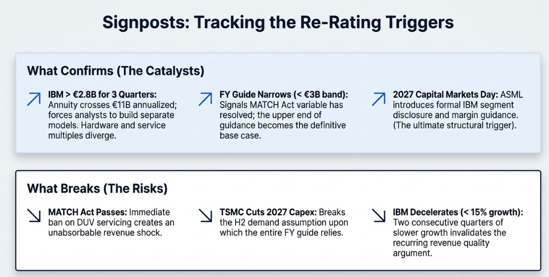 The specific catalyst that forces the correction is the 2027 Capital Markets Day. If ASML introduces formal IBM segment disclosure or separate margin guidance, which the business now justifies by size, every sell-side model gets rebuilt on the same day. The stock moves on the model rebuild. That is a structural event, not a sentiment shift. It arrives because the math requires it.