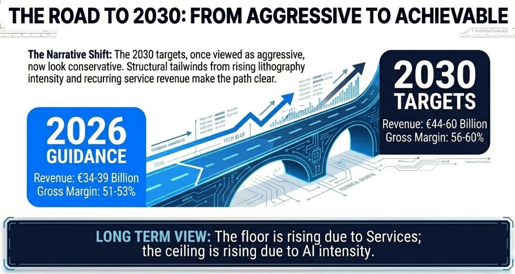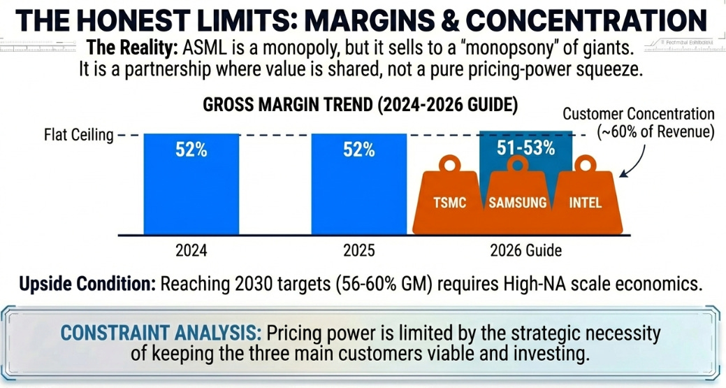 The 2030 targets , 56-60% gross margins at €44-60 billion revenue , require High-NA reaching scale economics and customer concentration easing through Intel’s foundry recovery or new entrants. Both are plausible but neither is guaranteed. Margins remain a “show me” story.