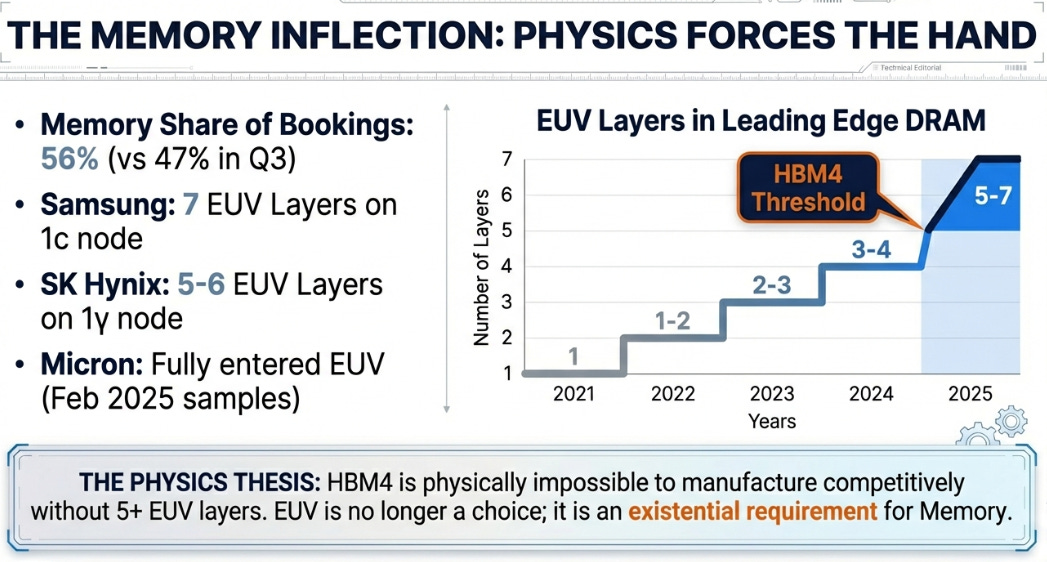This is a technology adoption curve inflecting. SK Hynix is now running 5-6 EUV layers on their 1γ node. Samsung is at 7 layers on 1c. Micron shipped their first EUV samples in February 2025 , they were the last holdout, and now they’re in.