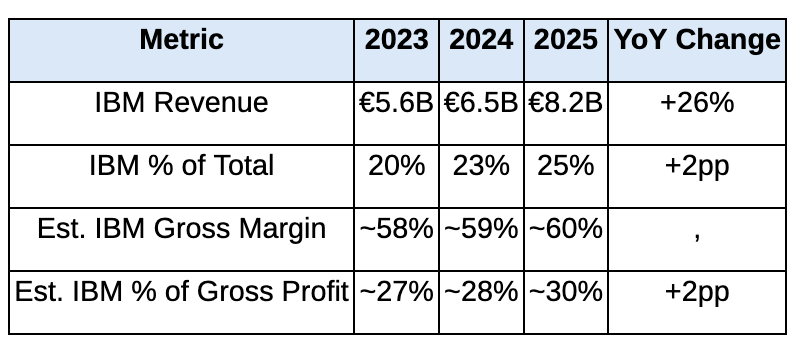 €8.2 billion in services revenue, growing 26% year-over-year. Now 25% of total revenue at estimated 60% gross margins, meaning roughly 30% of gross profit. And Q1 2026 IBM is guided to approximately €2.4 billion, implying a €9.6 billion annual run rate.