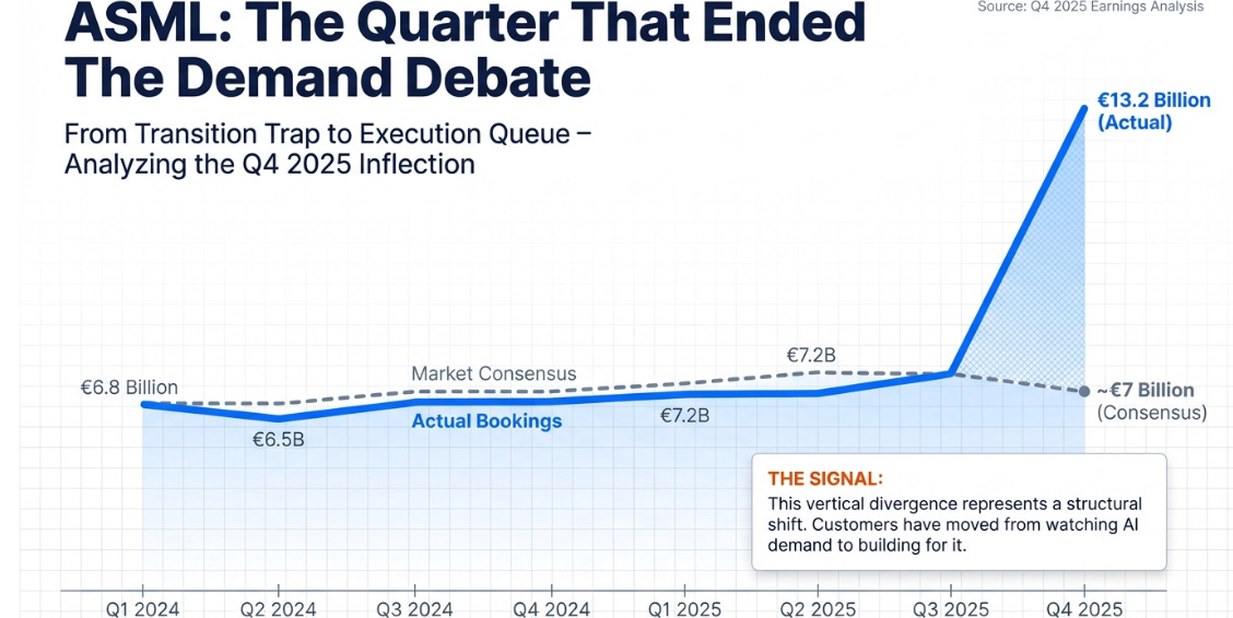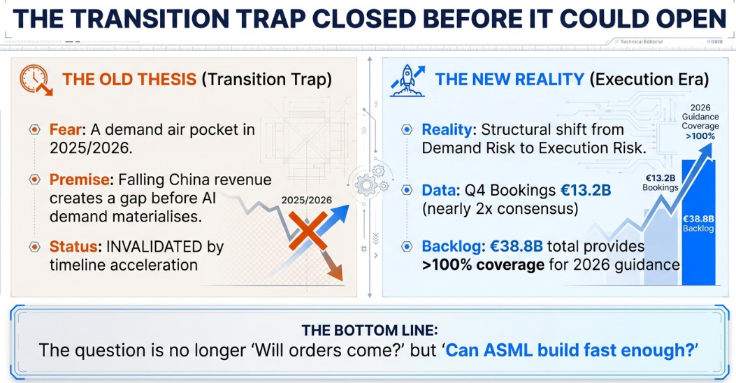 The transition trap never sprung. €13.2B in Q4 bookings and €38.8B in backlog mean ASML enters 2026 fully demand-covered, the risk has shifted from will orders come? to can ASML ship fast enough?