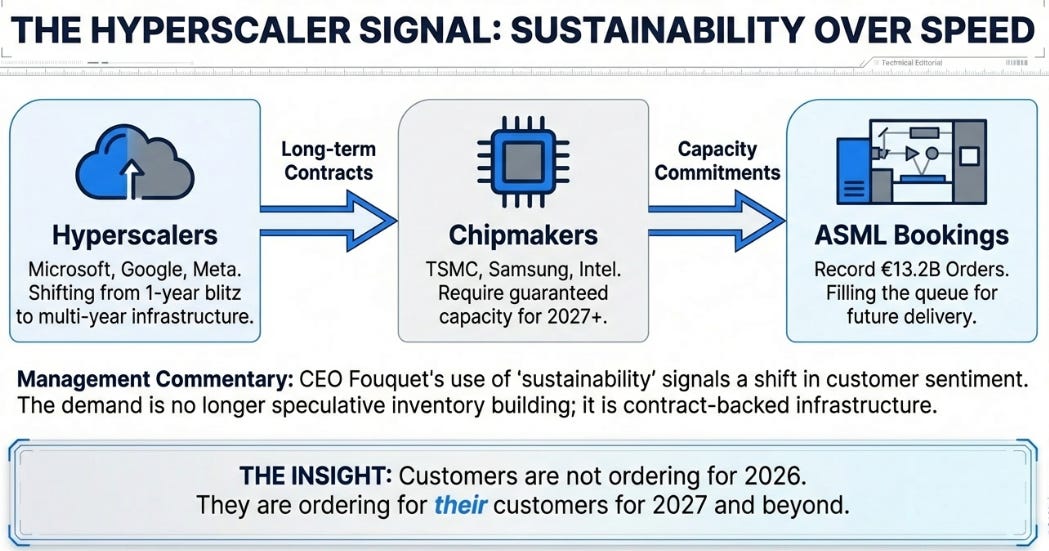 I want to highlight “notably more positive” and “sustainability.” ASML executives are methodical and measured. When Fouquet uses emphatic language about customer sentiment shifting, he’s signaling something specific: the hyperscalers are communicating to their chip suppliers that this isn’t a one-year spending blitz. It’s structural.