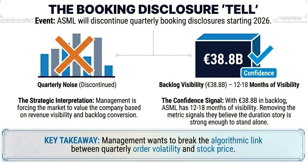 Starting in 2026, ASML will discontinue quarterly booking disclosures. They announced this at Investor Day in November 2024, framing it as reducing “short-term noise” in favor of focusing on “long-term value creation.”