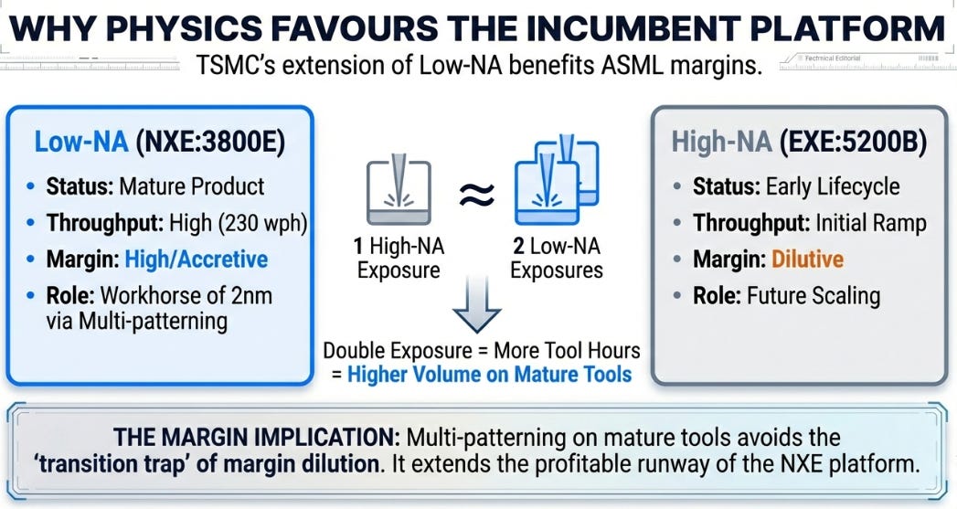 This is the point Gemini raised that deserves expansion. TSMC is achieving 2nm through multi-patterning on Low-NA EUV tools rather than adopting High-NA. The market initially worried this would hurt ASML , that TSMC was delaying the High-NA transition.