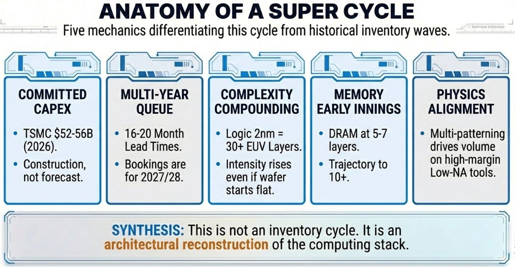 This looks less like a cycle, more like a queue. Multi-year capex commitments, rising lithography intensity, and a fast-compounding services annuity point to a genuine semiconductor super-cycle, not a one-year AI spike.