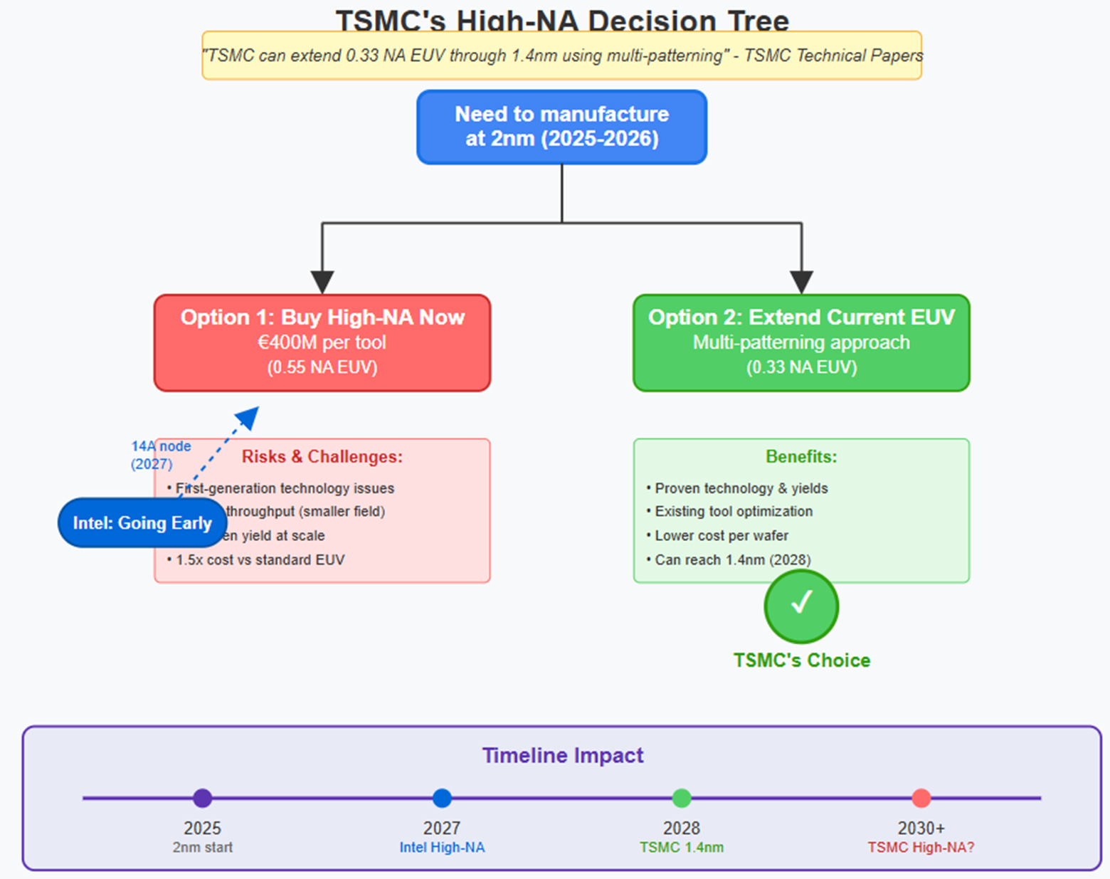 Think about this from TSMC’s perspective. They’re the Tiger Woods of chip manufacturing—consistently excellent, methodically careful, never early to any technology party. Their engineers have figured out how to stretch current EUV systems through at least two more chip generations using clever techniques like multi-patterning. As TSMC explicitly stated, they won’t use High-NA EUV for their 1.4nm node in 2028, preferring to extend conventional EUV with multi-patterning innovations.