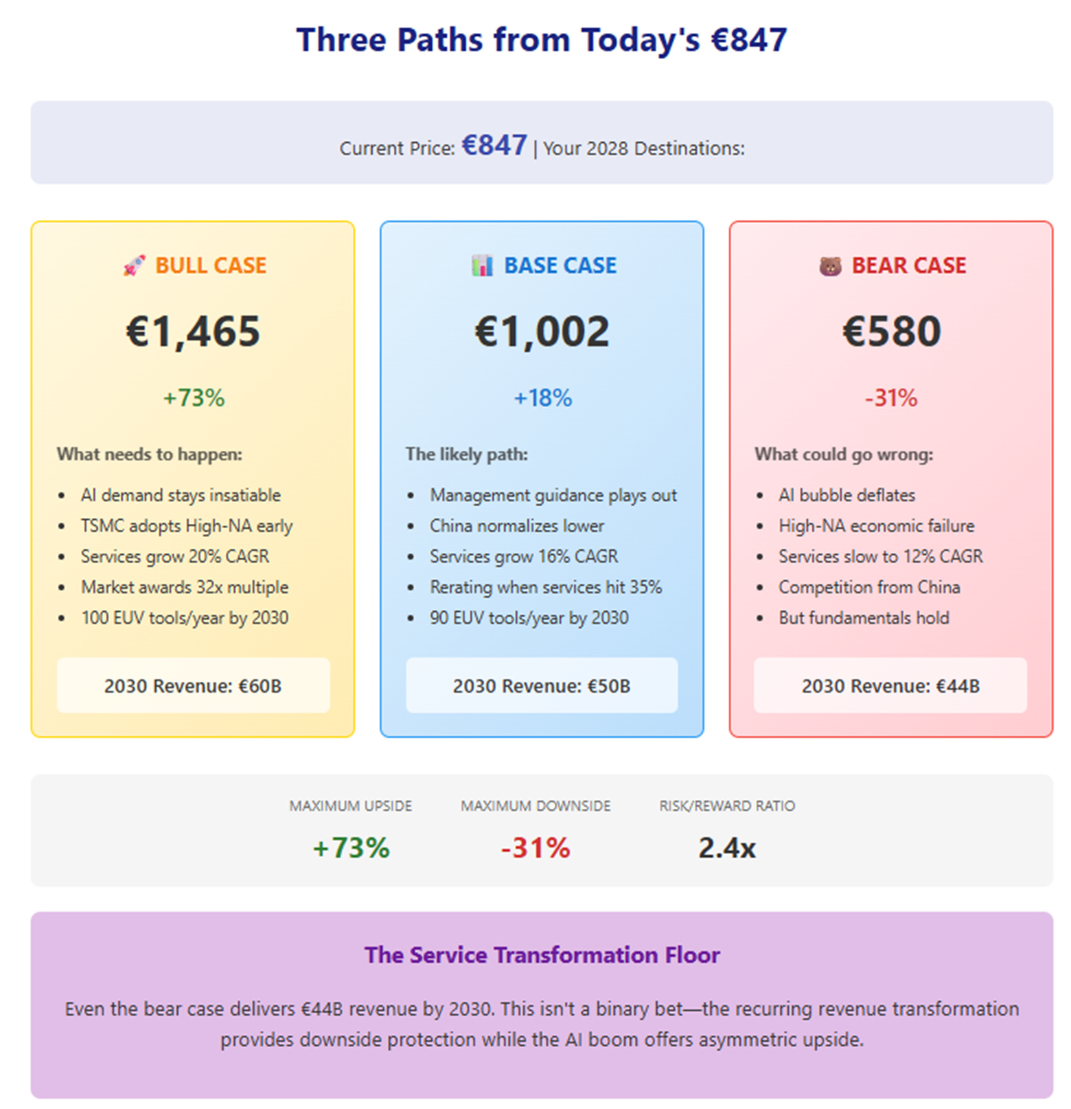 The Bull Case (€1,465/share): AI demand stays insatiable, High-NA takes off faster than expected, and the service business maintains 20% growth. TSMC decides they need High-NA for their 2027 nodes, triggering an industry-wide upgrade cycle. The market finally recognizes ASML as a services company and awards it a 32x multiple. Research shows logic customers could need 80-100 EUV tools annually by 2030, up from ~50 today.