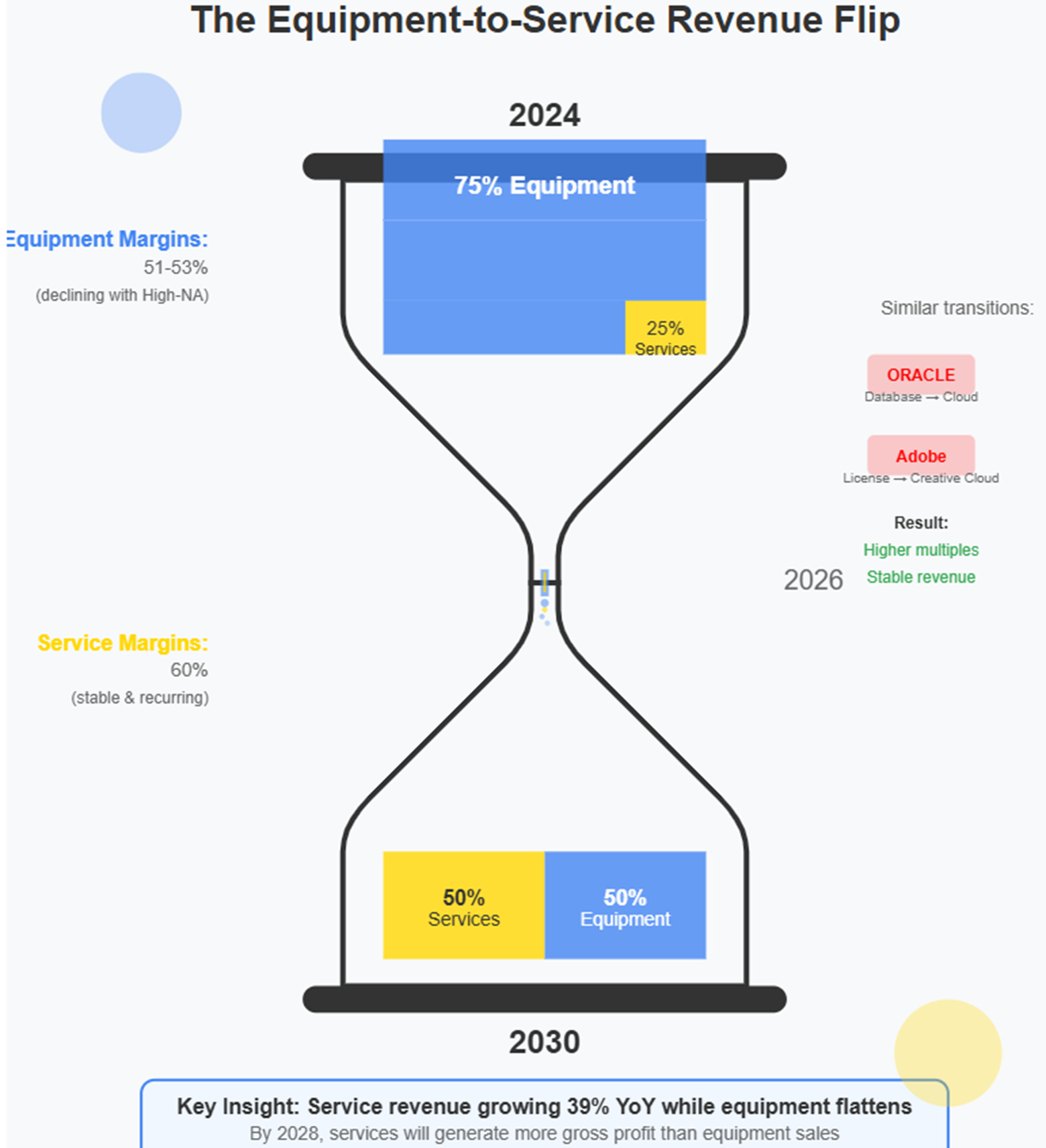 The service transformation is real, irreversible, and underappreciated. By 2027-28, when Install Base Management crosses 35% of revenue and High-NA finally achieves scale, the market will suddenly “discover” that ASML is actually a high-margin recurring revenue business that happens to sell equipment.