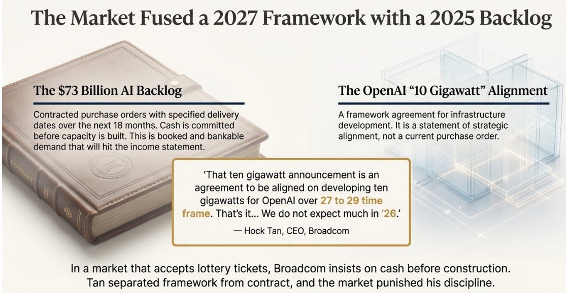 Tan did the opposite. He drew the distinction on a public earnings call, in unambiguous language, separating framework from contract and 2027 from 2026. In a market where everyone else accepts lottery tickets, Broadcom insists on cash before construction.