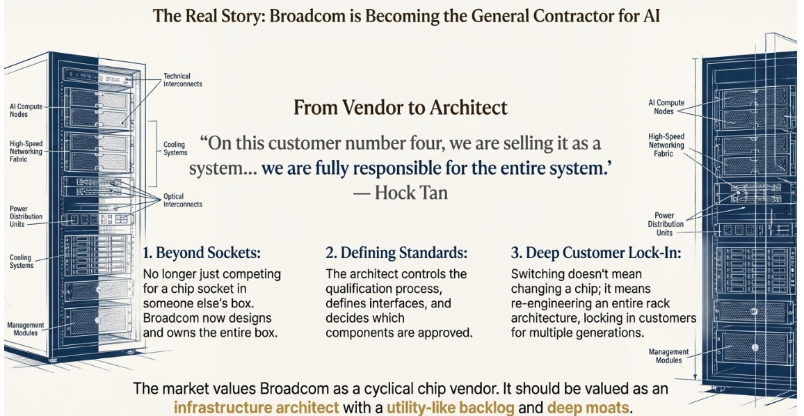 What’s genuinely new: Broadcom is changing what kind of company it is. The shift from component supplier to infrastructure architect has implications for competitive positioning, customer lock-in, and appropriate valuation that the market hasn’t fully processed.