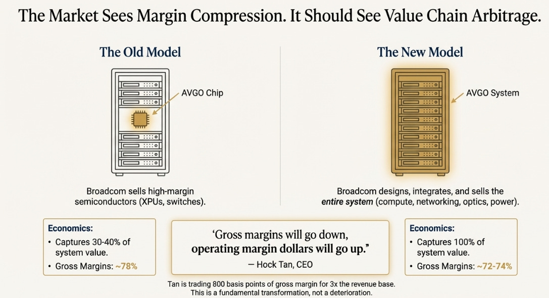 The new model works differently. Broadcom designs, integrates, and takes full responsibility for complete AI racks. Compute, networking, optics, power delivery — the entire system. They pass through third-party components they don’t manufacture themselves, which pushes gross margins down. But they capture 100% of the system value instead of 30-40%, which means absolute profit dollars multiply even as percentages decline.