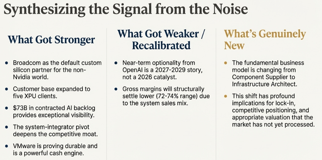 What got stronger: The evidence that Broadcom is the default custom silicon and networking partner for serious AI infrastructure outside Nvidia. Five XPU customers, up from one. $73 billion in AI backlog with delivery visibility. Anthropic doubling down with $21 billion committed. The system-integrator pivot deepening the moat with every rack shipped. VMware proving durable rather than depleting.