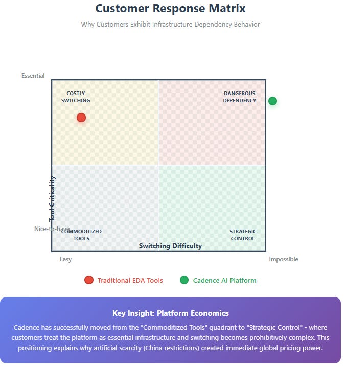 This creates a paradox that reveals everything about Cadence's market position. In normal vendor relationships, constrained supply in one geography might shift demand patterns but wouldn't enable immediate global pricing power. What actually happened suggests something fundamentally different: customers elsewhere treating design schedule continuity as existential, willing to pay premiums and accelerate purchase timelines rather than accept any risk of delay.
