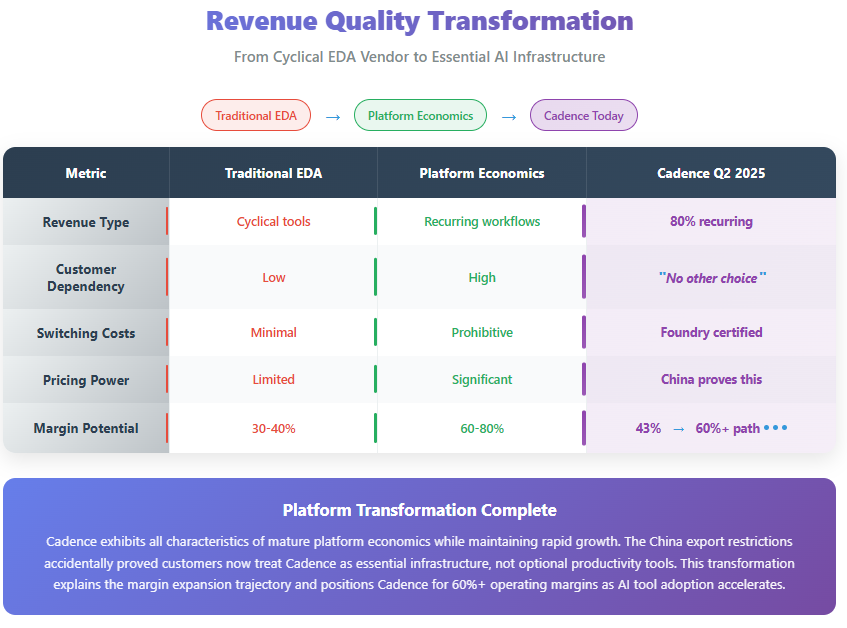This matters enormously for understanding Cadence's margin expansion potential. Traditional EDA companies face pricing pressure on individual tools; platform companies capture value through workflow integration and productivity improvements across multiple product categories.