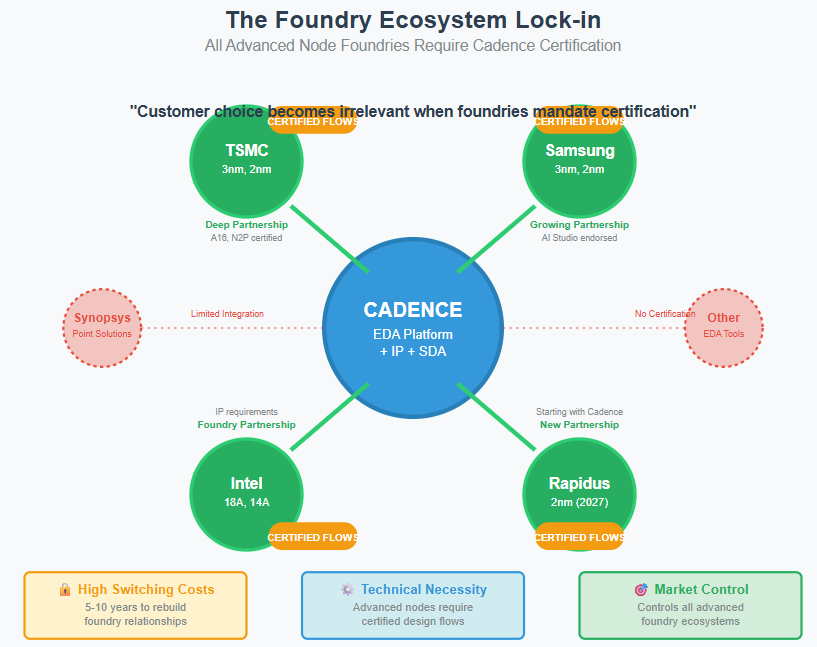 Perhaps the most underappreciated aspect of Cadence's competitive positioning is their control over foundry certification processes. When Devgan mentioned working with "all four major advanced foundries" (TSMC, Samsung, Intel, Rapidus), he's describing ecosystem control that creates mandatory adoption for the most valuable designs.