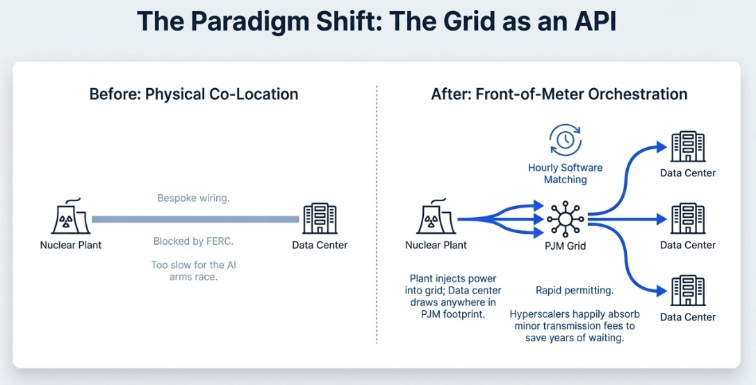 Faced with a regulatory blockade on behind-the-meter co-location, Constellation is pivoting to front-of-the-meter deals that use the existing PJM transmission grid as the interconnection layer. The mechanics are straightforward: Constellation injects clean, firm power into the grid from its 180-million-megawatt-hour nuclear fleet. The hyperscaler builds its data center wherever zoning is friendly and permitting is fast, anywhere in the PJM footprint, and draws that power down. Hourly matching software verifies the clean energy delivery.