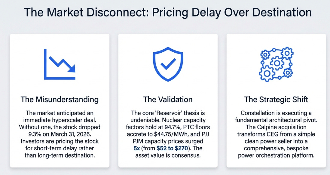 What changed is that the market learned something we should have emphasized more: reservoirs are only valuable if the pipes reach the customers. Constellation is building those pipes, through front-of-meter deals, regulatory filings, AI-enabled flexibility partnerships, and the broadest commercial platform in the power sector. But building pipes in a regulated industry takes longer than filling reservoirs in a scarce one.