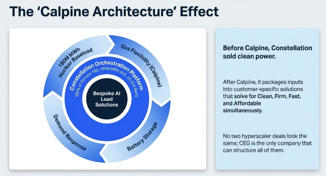 The real update is strategic, not quarterly. Calpine changes Constellation from a seller of clean power into a broader power orchestration platform: nuclear, gas, batteries, demand response, and commercial relationships can now be packaged into customer-specific solutions.