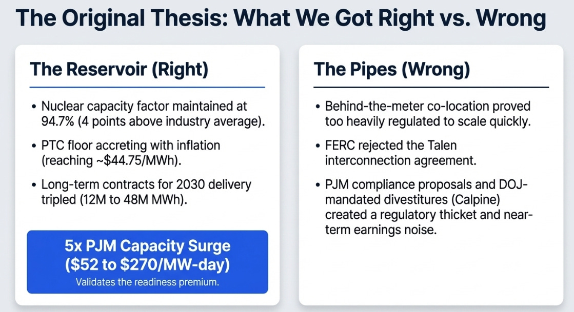 Where we were wrong was about the pipes. We framed behind-the-meter co-location, physically wiring a data center to a nuclear plant, as the primary monetization path. It turned out that FERC’s rejection of the Talen interconnection agreement, followed by PJM’s unworkable compliance proposal and the executive order that forced hyperscalers to renegotiate contract terms, created a regulatory thicket that made direct co-location impractical at scale. We also didn’t anticipate that the Calpine acquisition would close with DOJ-mandated divestitures of highly efficient gas plants, creating near-term earnings noise that obscured the deal’s strategic value.