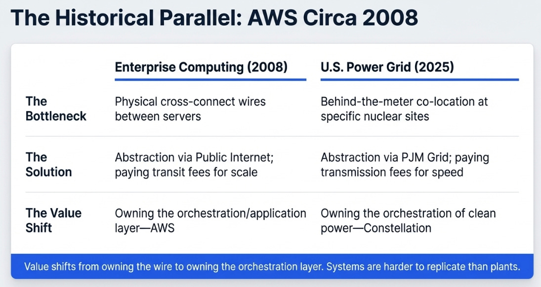 This is not a retreat from the data center thesis. It’s an architectural upgrade. Constellation can now execute deals anywhere in the grid without waiting for bespoke FERC rulings on each site. The hyperscaler pays modest transmission fees, a cost they’ll absorb willingly because their bottleneck is time, not electricity prices. In the AI arms race, waiting three years for co-location approval is far more expensive than paying grid charges.