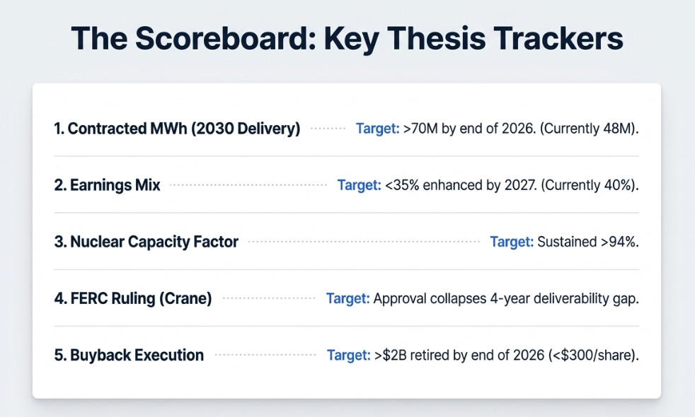 First, contracted megawatt-hours for 2030 delivery. Currently 48 million, up from 12 million a year ago. Above 70 million by year-end 2026 means the contracting engine is converting scarcity into base earnings. Below 55 million means the regulatory friction is winning.