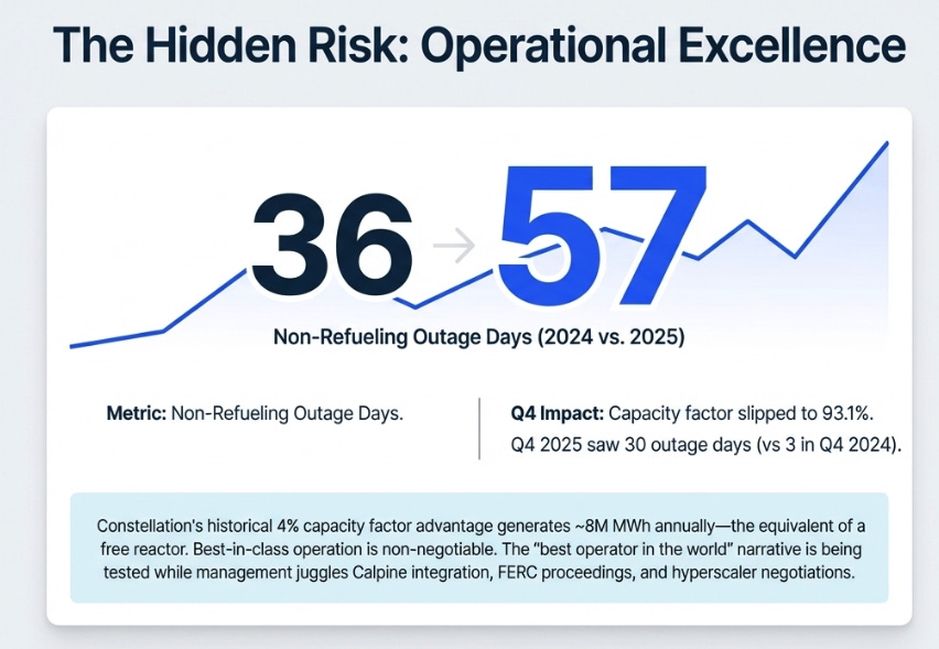 For any other company, this would be a footnote. For Constellation, it is the most important operational metric in the business. The entire thesis depends on the nuclear fleet running at best-in-class levels. Management has argued for years that their four-percentage-point capacity factor advantage over the industry translates into roughly 8 million additional megawatt-hours annually, effectively an extra reactor, generated for free by operational excellence.