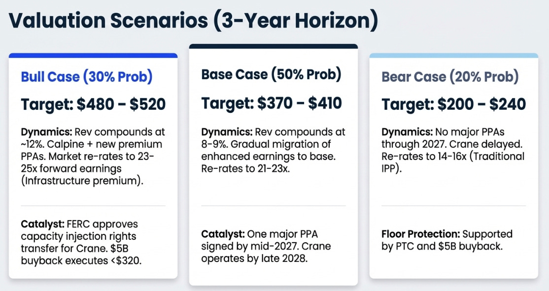 No new major PPAs materialize through 2027. Enhanced earnings normalize faster than new contracts replace them. Gas fleet utilization disappoints. Crane is formally delayed past 2029. Nuclear fleet capacity factor slips below 93% on a sustained basis as management attention is divided across too many priorities. The market re-rates to 14–16 times forward earnings, traditional IPP territory, on EPS of roughly $14–15 in 2028. The PTC floor and buyback authorization provide mechanical support, preventing a collapse below $200, but the premium multiple evaporates.