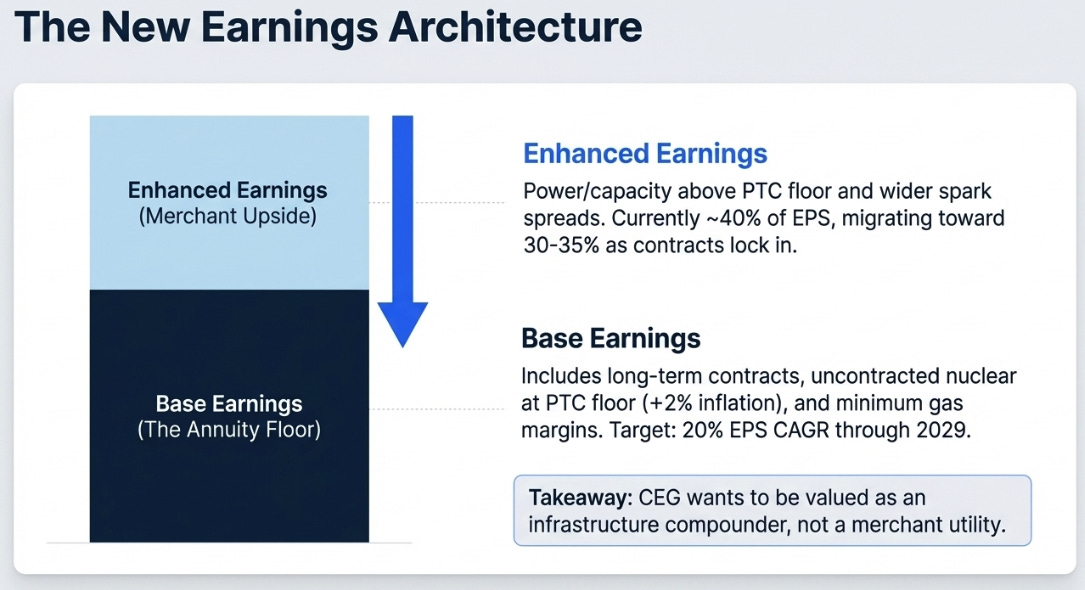 This distinction matters because it reveals what management is actually arguing. Companies introduce new metrics when they want the market to see a different business. The old Constellation was a strong merchant-contract hybrid. The new Constellation wants to be valued as a contracted platform with a durable earnings floor and a large inventory of unmonetized optionality. Management is making a re-rating argument without quite calling it one.