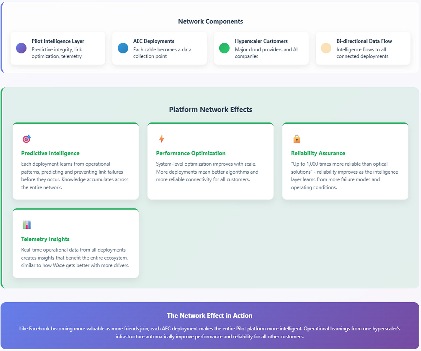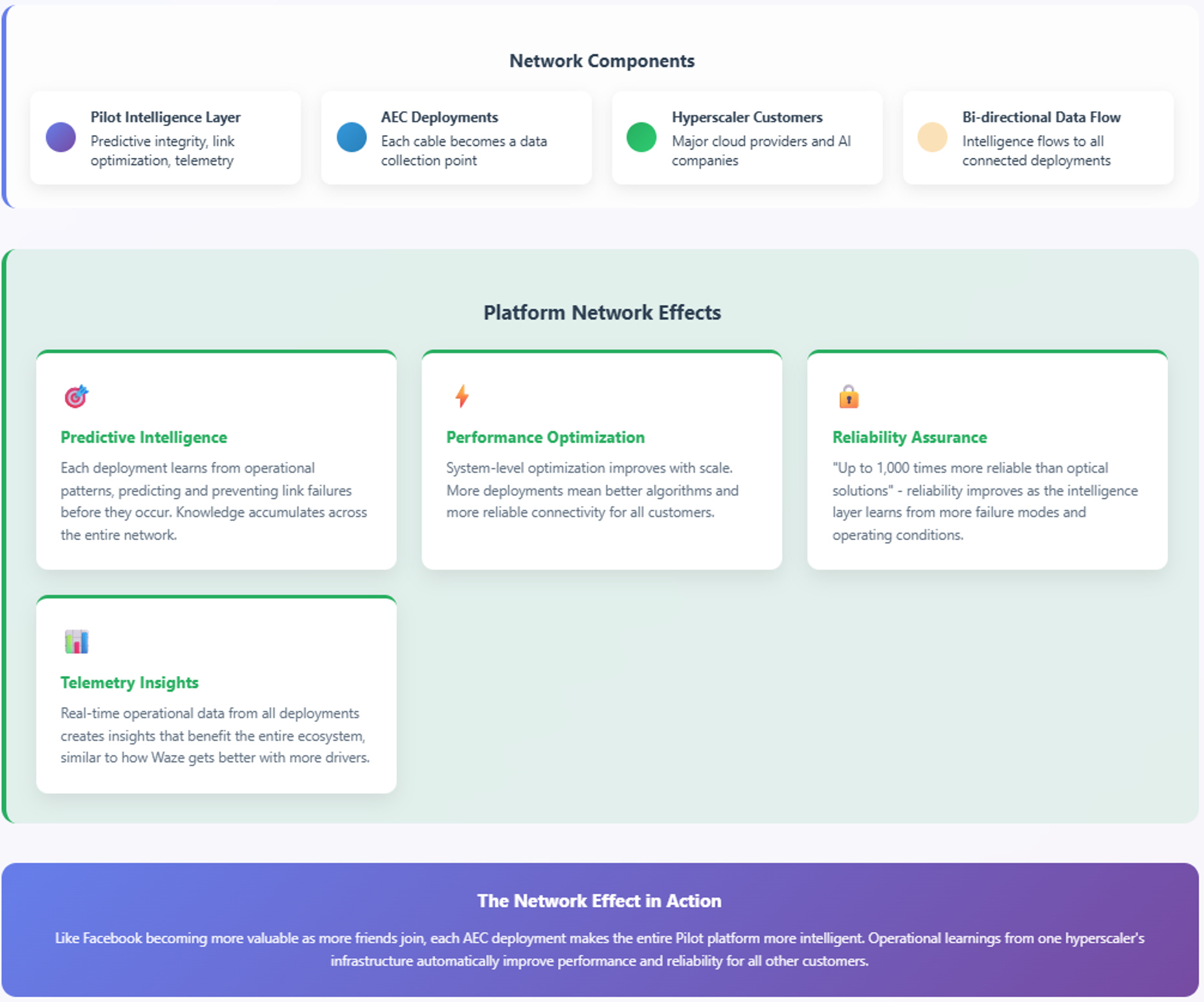 The Pilot platform—"predictive integrity, link optimization, and telemetry"—transforms every hardware deployment into a data collection point. Think of it like a smart thermostat that doesn't just control temperature but learns your patterns and optimizes your entire home's energy usage. When Brennan claims AECs are "up to 1,000 times more reliable" than optical solutions and "virtually eliminate link flaps," he's addressing a critical problem.