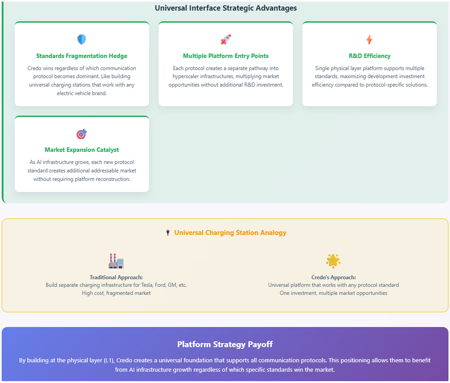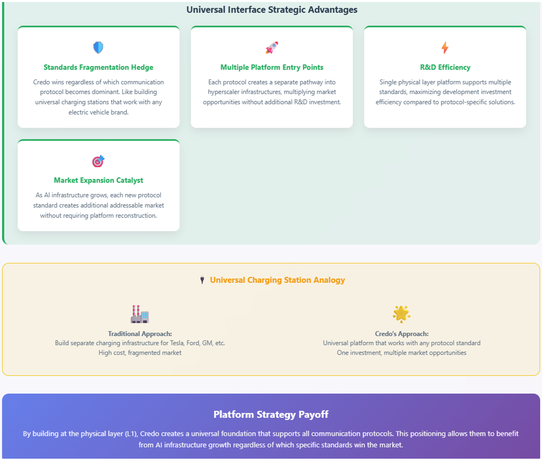 Think of this like building universal charging stations that work with Tesla, Ford, GM, and any other electric vehicle rather than building separate infrastructure for each brand. This hedges against standards fragmentation while creating multiple platform entry points—Credo wins regardless of which communication protocol becomes dominant.
