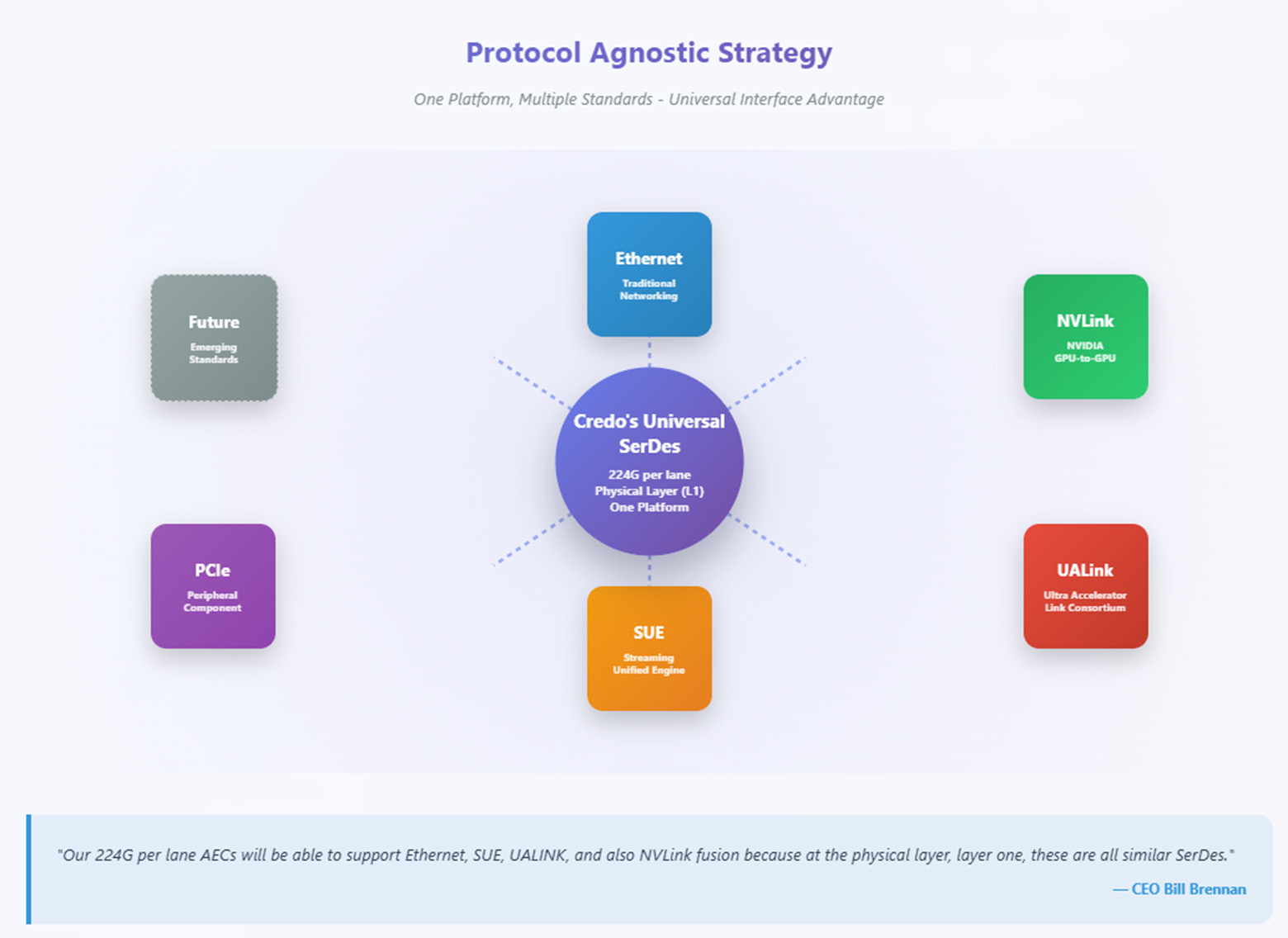 Credo's protocol-agnostic approach to the upcoming 200G/lane transition reveals platform thinking at scale. When Brennan explained that their "224G per lane AECs will be able to support Ethernet, SUE, UALINK, and also NVLink fusion" because "at the physical layer, layer one, these are all similar SerDes," he described a universal interface strategy.